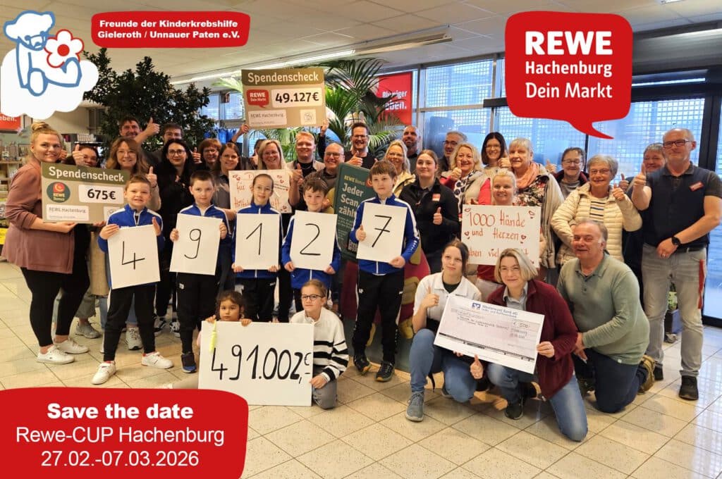 Vom 27. Februar bis 07. März 2026 findet im REWE‑Markt Hachenburg wieder der jährlich stattfindende REWE‑Cup zu Gunsten der @Freunde der Kinderkrebshilfe Gieleroth / Unnauer Paten e.V. statt.