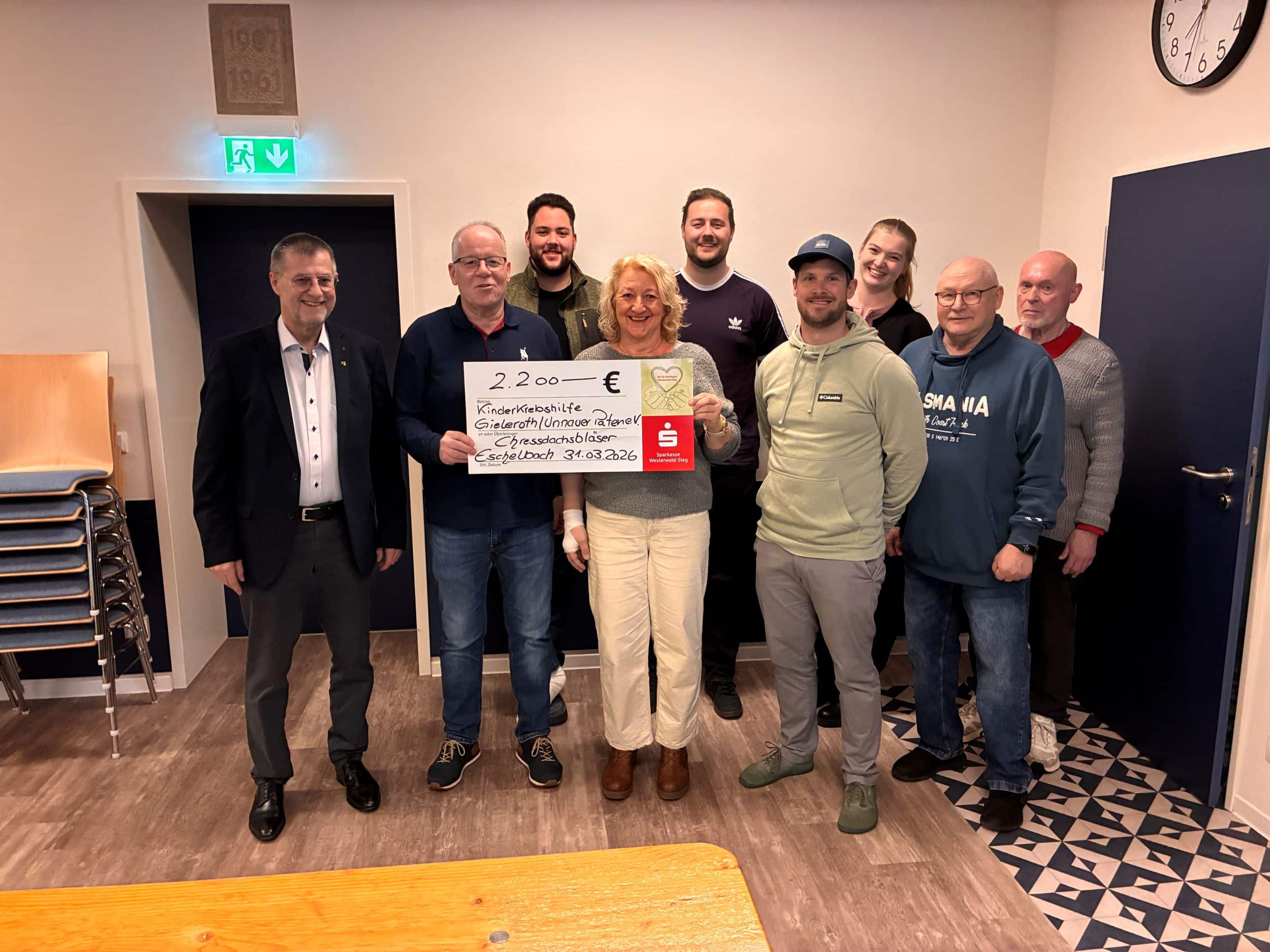 Bei ihrer traditionellen Aktion kam ein Scheck über 2.200 Euro zusammen, den die Bläser nun feierlich an die Kinderkrebshilfe Gieleroth/Unnauer Paten übergaben. Die Vertreter der Organisation nahmen die Spende dankbar entgegen. „Wir sind immer wieder beeindruckt von der Treue und dem Engagement der Chressdachsbläser“, erklärte ein Sprecher. „Mit dieser Unterstützung können wir unsere Arbeit für betroffene Kinder und Familien weiterhin fortsetzen.“